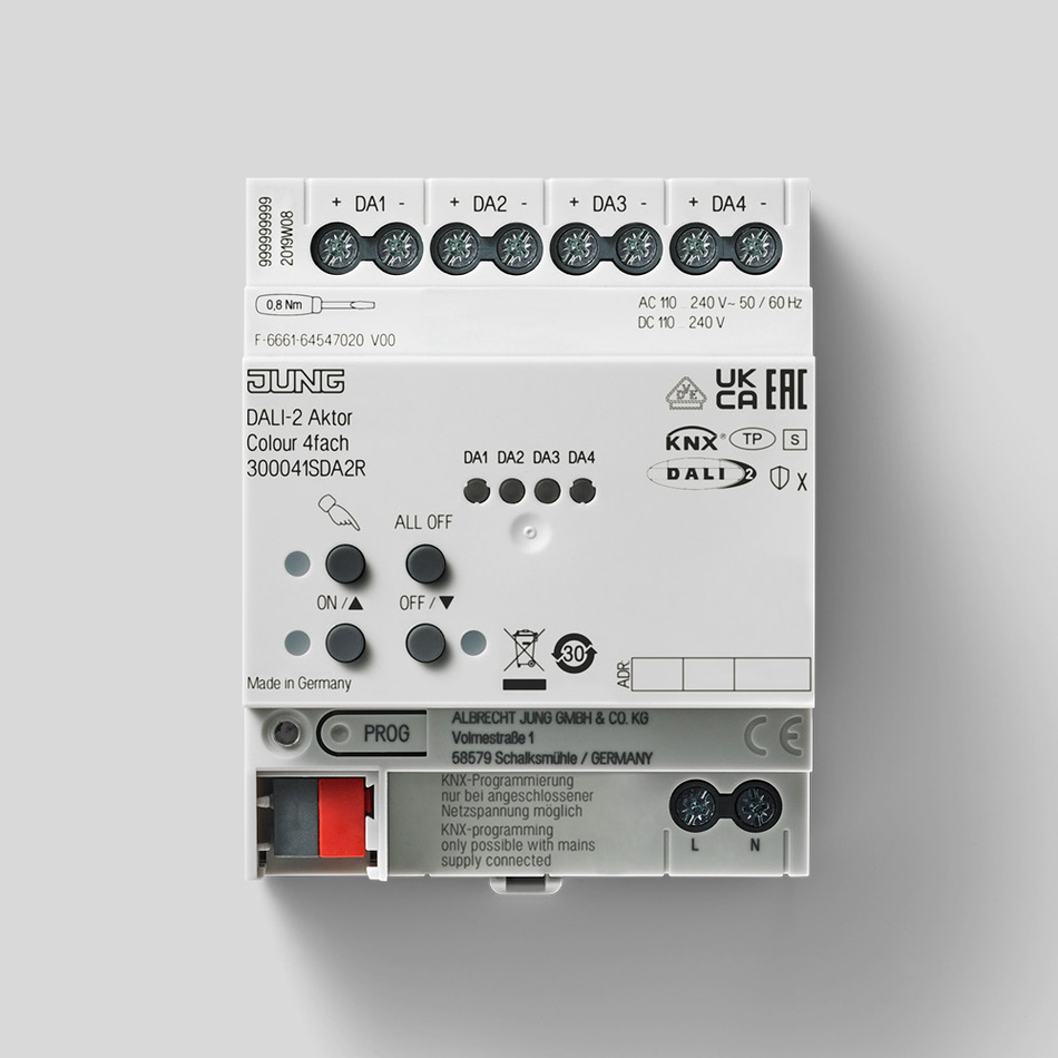 JUNG hat mit dem KNX DALI 2 Gateway Colour und dem KNX DALI 2 Aktor Komponenten auf den Markt gebracht, die die Integration von KNX- und DALI-Systemen in der Gebäudeautomation gewährleisten. Auch in der Nachrüstung einer 1-10-Volt-Leitung. Das JUNG KNX DALI 2 Gateway Colour ist speziell für die nahtlose Integration in KNX-basierte Gebäudemanagementsystemen konzipiert und ermöglicht eine präzise Steuerung von DALI-Betriebsgeräten. Mit dem KNX DALI 2 Gateway Colour können effizienter als je zuvor verwaltet werden. Zu einem der wichtigsten Merkmale gehört die Unterstützung von bis zu sechs Adressierungsarten, die eine detaillierte gruppenorientierte und einzeladressierte Steuerung von Leuchten ermöglichen. Dies ist besonders vorteilhaft für große Räume wie Büros, Ausstellungsflächen und Schulungsräume, in denen eine individuelle Lichtsteuerung erforderlich ist.